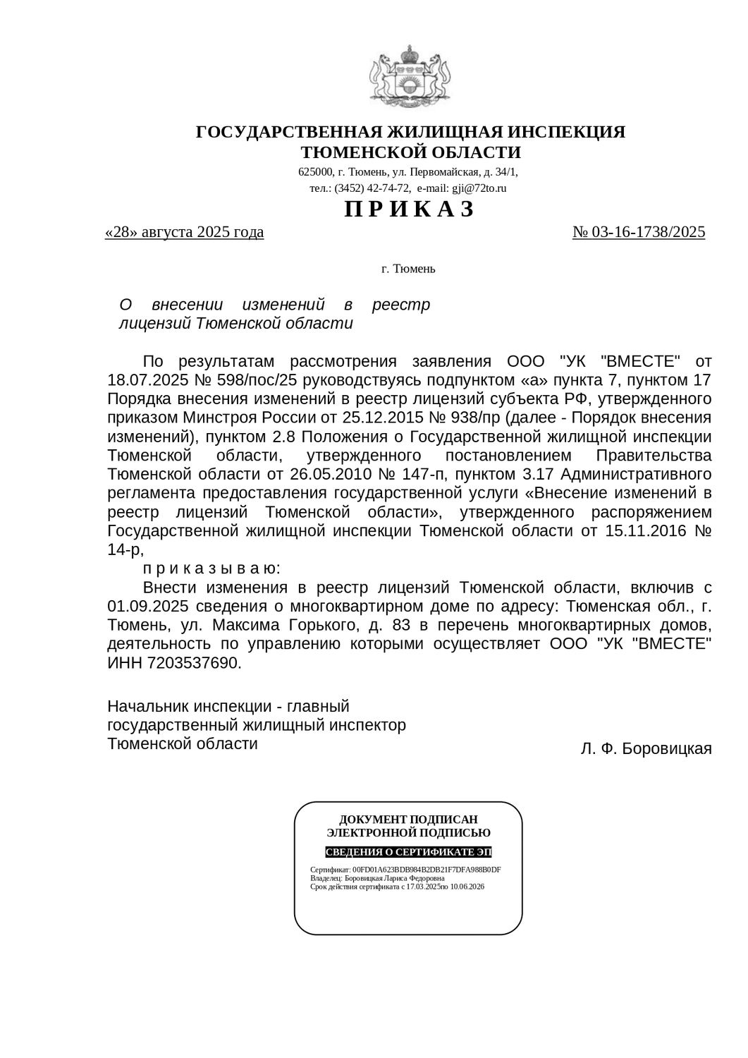 - В управлении и на техническом обслуживании ООО "УК "Вместе" с 01 сентября 2025 года