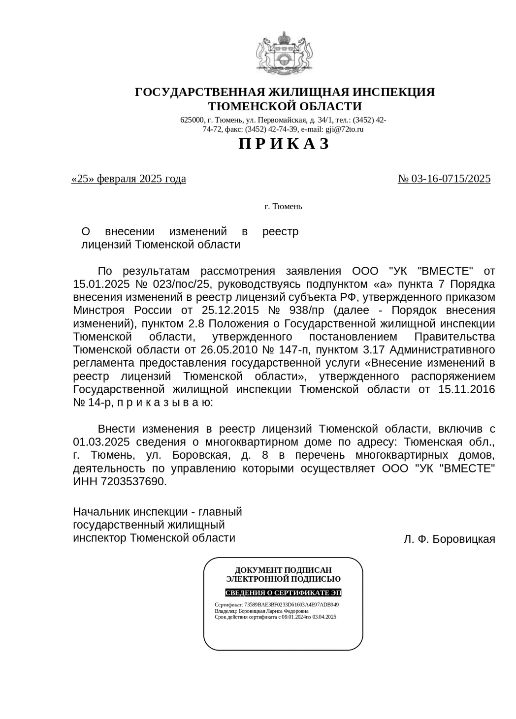 Жилой дом по адресу: г. Тюмень, ул Боровская, д. 8 перешел в Управляющую компанию "Вместе" в марте 2025 года.
